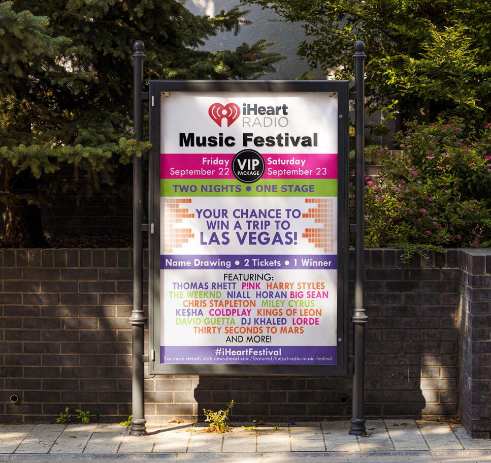 The VP of our department at Wahl asked me to create a promotional poster for an iHeartRadio music festival. This poster would be displayed company wide at many locations.I chose a bright selection of colors and used the colors throughout the entire design with a focus on the artists that would be at the festival. This allowed the poster to stand out despite having no images provided to work with. Simply text, shapes, and colors.